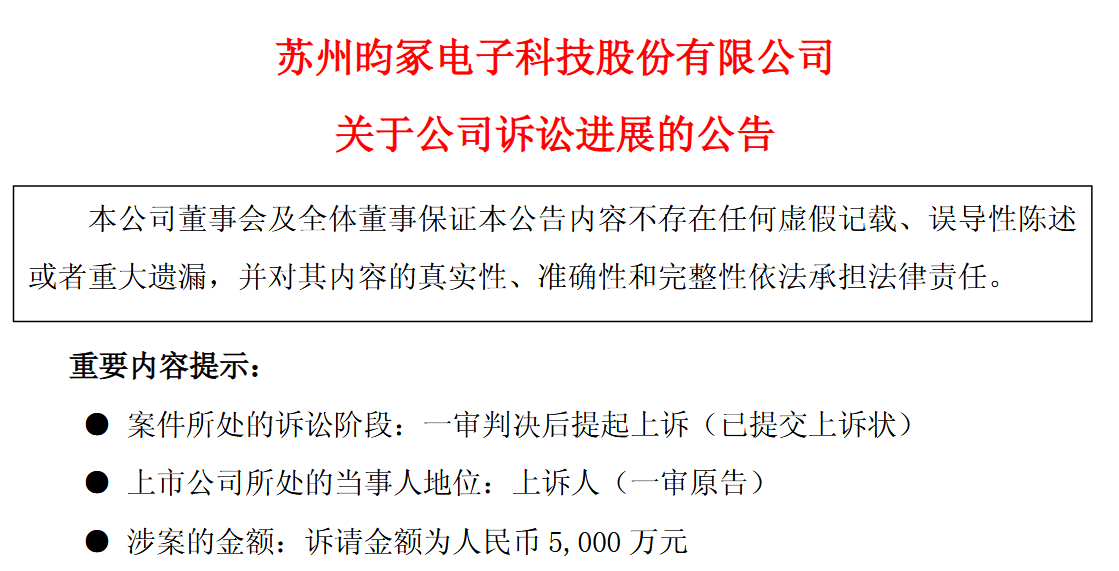 报告期内,昀冢科技涉及一起重大诉讼事项。昀冢科技就苏州盛芯精密科技有限公司、王成才等人侵害商业秘密事项提起诉讼,一审判决获赔478.5万元,公司已向江苏省高级人民法院提起上诉,请求改判支持全部5000万元诉讼请求。