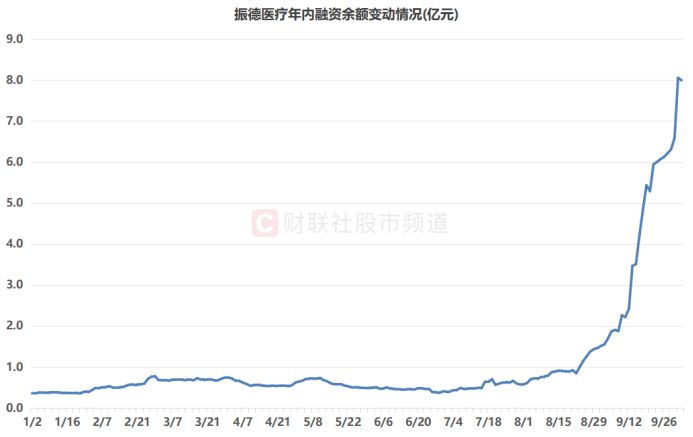 从资金面来看,振德医疗近期的上涨之旅获融资客大举助力。截至10月13日数据,其目前融资余额达7.99亿元,较2个月前(8月13日)的0.87亿元增长7.12亿元,增幅近8.16倍。其中,振德医疗10月10日融资余额一度升至8.05亿元,为上市以来最高纪录,同时,其在10月10日获融资客近1.47亿元加仓,也为上市以来最高单日融资净买额纪录。