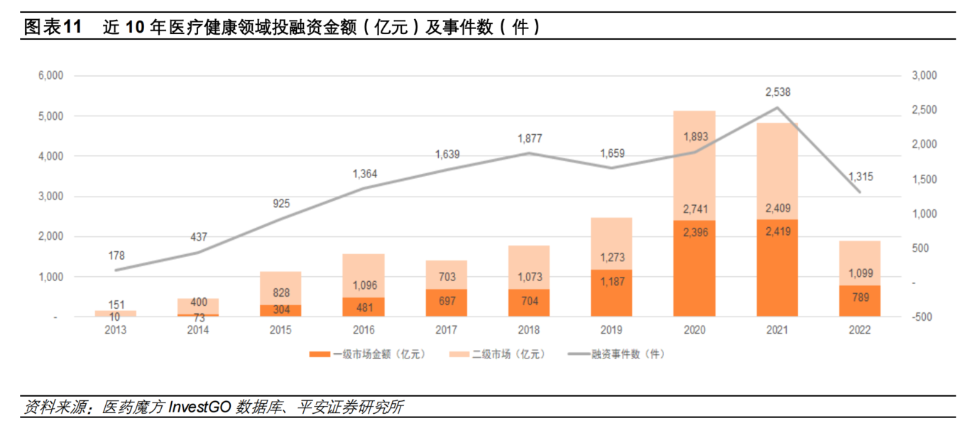 并且,中国医疗健康领域投融资环境低迷。在2022年以后,一、二级市场投融资额分别为789亿元、1099亿元,同比下降67.4%、54.4%。投融资事件数同比下降51.8%。