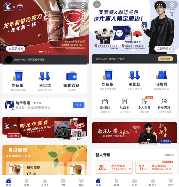 新消费日报也发现在营销投放上,酱香巧克力并未登上瑞幸小程序开屏首个弹窗。在微信端,小程序首页展示位置相对较少,反而是瑞幸新代言人易烊千玺联名商品在小程序中占据主要比例,且有多个露出位置。