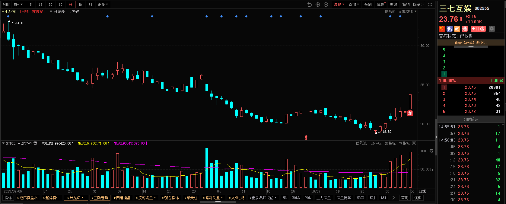 3)参考技术指标:三七互娱-升龙诀指标-出现龙信号