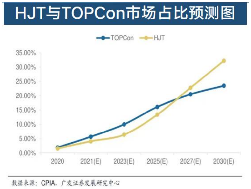 据光伏行业协会统计,2021年PERC电池片市场占比约91%,HJT、TOPCon电池合计占比不足3%;预计到2025年,以HJT和TOPCon电池为代表的超高效电池技术占比合计将接近40%,2030年有望超75%。