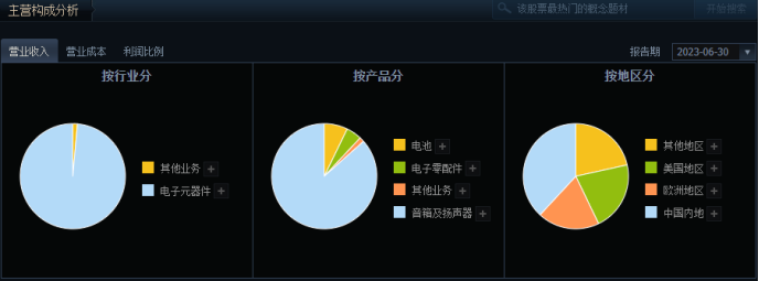 目前,电声音响业务为公司的核心业务,占营收比重始终保持在90%以上,对毛利的贡献保持在85%以上。分地区来看,公司的大部分营收来自海外,但近年来,公司加大国内客户的开拓力度,产品内销比例在增加。