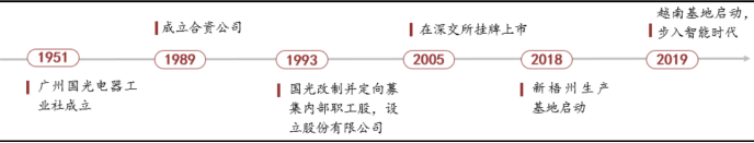 国光电器是一家专注于电声产品的设计、制造和销售的高新技术企业。前身为广州国光电声总厂,企业历史可追溯到1951年成立的广州国光电器工业社。公司于1993年通过定向募集内部职工股,完成了股份制改造,并于2005年5月在深交所挂牌上市。公司深耕于电声领域,充分利用专业设计和生产制造扬声器的传统优势。经过70年的积淀,公司凝聚了一批优秀的电声行业管理及研发人才,积累了丰富的设计制造经验及客户资源。