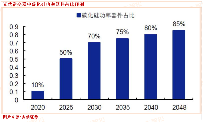 近年来,越来越多的公司投资碳化硅光伏逆变器,追求低能耗、轻量级、高效率等,根据CASA 预测,在2048 年,光伏逆变器中碳化硅功率器件占比可达85%。