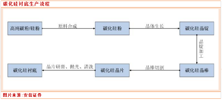碳化硅衬底的制作流程一般包括原料合成、晶体生长、晶锭加工、晶棒切割、晶片研磨、抛光、清洗等环节。其中晶体生长阶段为整个流程的核心,决定了碳化硅衬底的电学性质。