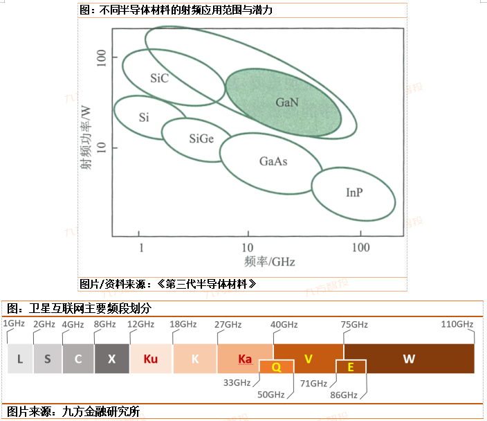 着眼当前卫星网络主用频谱高频化发展浪潮,星载射频与接收器件的性能是保证我国获得竞争优势的直接基础。对此,以金属镓(Ga)为核心的第二与第三代半导体材料作为实现高频段射频器件的关键环节,大概率将直接受益于卫星通信系统的频谱资源争夺;结合射频功率来看,氮化镓(GaN)材料在射频领域的战略价值毋庸置疑。