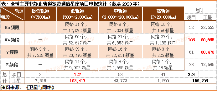 当前的全球卫星互联网建设重点呈现出了鲜明的“低轨道、高频段”特征。研究统计数据显示,截至2020年,全球范围内申报的卫星通信星座项目共计224个,包含了156,298颗卫星。在轨道资源方面,低轨区间的申报项目数量与规划卫星数量均领先其他轨道区间一个数量级,是各国聚焦争夺的绝对重点。同时,在频谱资源方面,Ka与V频段的规划卫星数量及星座项目数量也占据了绝对多数,是现阶段卫星互联领域要抢夺的关键方向。