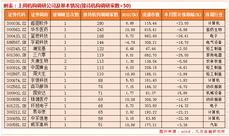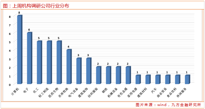 从行业分布来看,本周计算机行业内有8家上市公司接受调研,随后为电子、化工、轻工制造、医药生物行业,均有超5家上市公司接受调研。