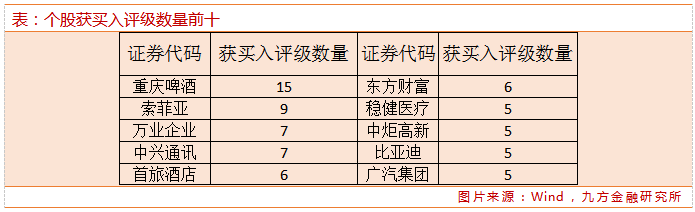 行业分布方面,电子行业获得55份研报给出买入评级,蝉联首位;随后为汽车、食品饮料,均获得超30份研报给出买入评级。