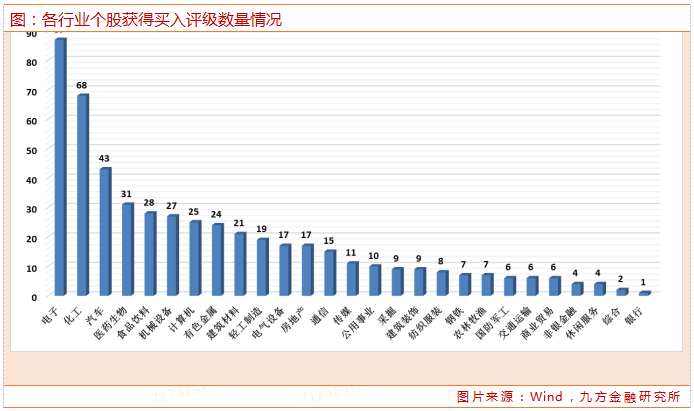 行业分布方面,电子行业位居前位,获得87份研报给出买入评级,其次为化工、汽车、医药生物行业,分别获得68、43、31份报告给出买入评级。