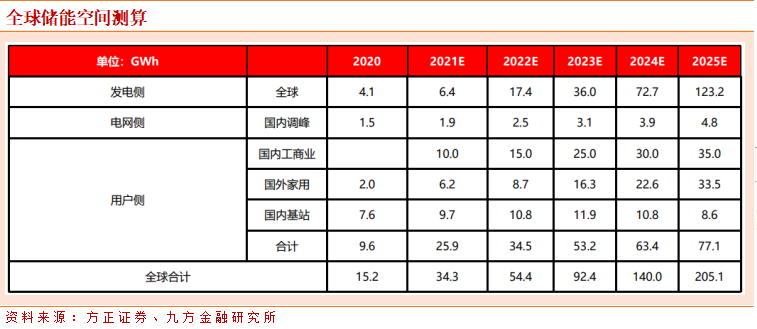 1) 发电侧,预计到2025年全球集中式光伏和风电新增装机248.1GW,假设2025年光伏50%、风电60%的新增装机会配置储能系统,功率配比30%,备电时长3小时,则2025年全球发电侧储能需求123.2GWh;